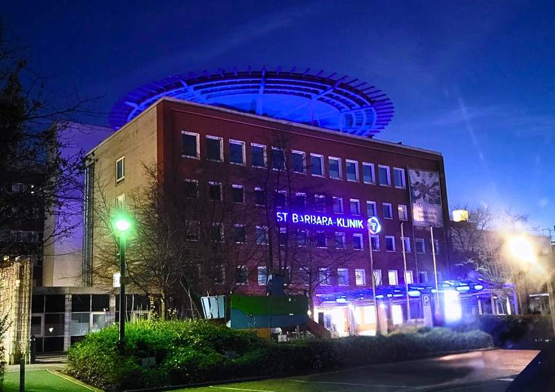 Um auch über die Informationsveranstaltung hinaus ein Zeichen für die Darmkrebsvorsorge zu setzen, erstrahlt das Dach der St. Barbara-Klinik im Übrigen den gesamten Monat März über in einem dunklen Blau – der Farbe der Darmkrebsschleife.