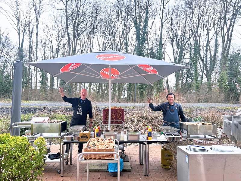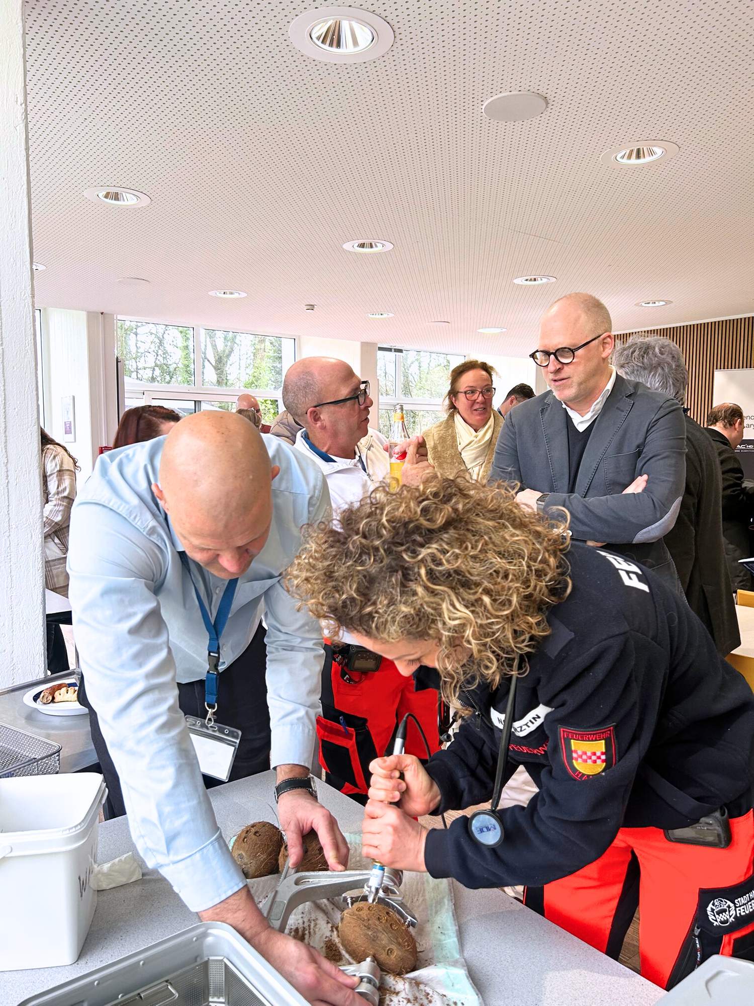 In der Pause nutzten die Teilnehmenden die Gelegenheit zum fachlichen Austausch und praktischen Üben: Am Stand der Firma Abiomed informierten sie sich aus erster Hand über die Impella-Pumpe, die Firma Storz stellte Köpfe und Instrumente für Intubationsübungen bereit. Unter Anleitung von Prof. Dr. Christian Ewelt, Chefarzt der Neurochirurgie, konnte an Kokosnüssen die Trepanation geübt werden – ein anschaulicher Praxisbezug zur neurochirurgischen Notfallversorgung. Das Pflegepersonal der Klinik demonstrierte unter anderem Fast-Sono und EZ-IO am Kunstknochen, also die Simulation eines intraossären Zugangs. Ein Imbiss vom Grill sowie ein Blick in die Notaufnahme und vom Hubschrauberlandeplatz rundeten die Pause ab.