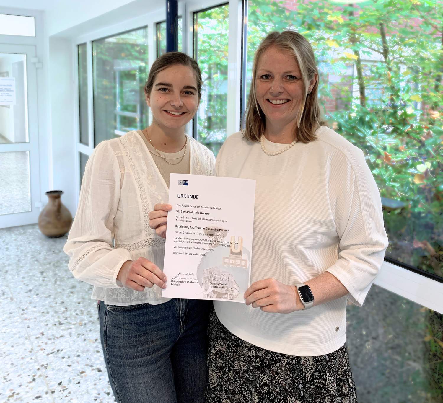 Im Rahmen einer feierlichen Veranstaltung in der Stadthalle Unna erhielt Frau Giesbrecht die 1er-Urkunde der IHK. Auch die St. Barbara-Klinik Hamm-Heessen wurde in diesem Zuge mit dem „Besten-Zertifikat“ für ihre hervorragende Ausbildungsarbeit geehrt.
