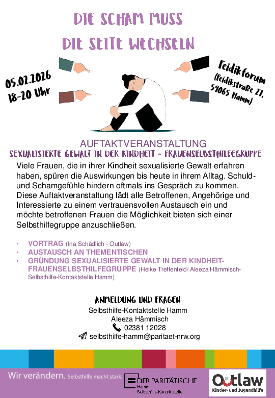 Viele Frauen, die in ihrer Kindheit sexualisierte Gewalt erfahren haben, spüren die Auswirkungen bis heute in ihrem Alltag. Schuldund Schamgefühle hindern oftmals ins Gespräch zu kommen. Diese Auftaktveranstaltung lädt alle Betroffenen, Angehörige und Interessierte zu einem vertrauensvollen Austausch ein und möchte betroffenen Frauen die Möglichkeit bieten sich einer Selbsthilfegruppe anzuschließen.