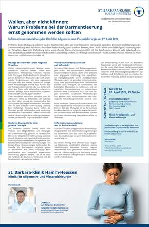 - Referenten: Oberarzt Carl-Nikolaus Keller, Klinik für Allgemein und Visceralchirurgie, Koloproktokogie, Visceralmedizin der St. Barbara-Klinik Hamm-Heessen, Leitender Oberarzt Dr. Sebastian Kiock, Klinik für Innere Medizin II: Gastroenterologie und Hepatologie, Visceralmedizin der St. Barbara-Klinik Hamm-Heessen
