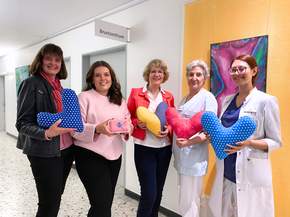 Die Patientinnen im Brustzentrum erhalten diese Herzkissen, um die Operationswunde zu entlasten. Und zudem sind sie noch eine echte Augenweide.