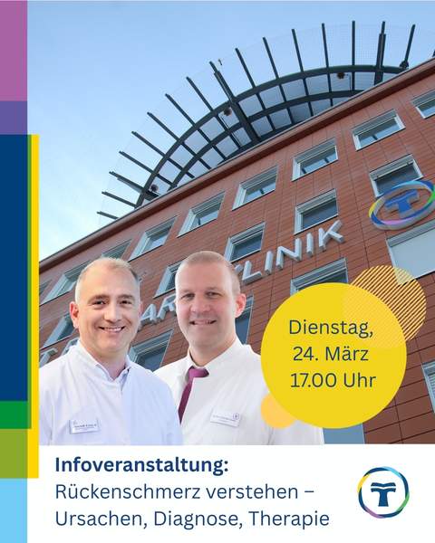 Die Chefarzt-Experten Priv.-Doz. Dr. med. Christian Ewelt und Dr. med. Adrian Komadinic informieren über konservative Behandlungsmöglichkeiten bei Rückenschmerzen, die Versorgung von Wirbelsäulenfrakturen und minimalinvasive Verfahren zur Behandlung degenerativer Erkrankungen wie Bandscheibenvorfälle, Spinalstenosen und Stabilisierungen. Im Anschluss besteht die Möglichkeit, individuelle Fragen zu stellen.